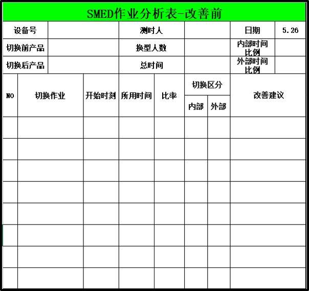 最初使用在汽車制造廠,以達到快速的模具切換(Exchange of Dies);豐田現場人員經過長期探索,將沖壓工序沖床模具裝換調整所需時間,從1945年至1954年的3小時,縮短為1970年以后的3分鐘,現在,豐田汽車公司利用設備快速裝換調整SMED法,所有大中型設備的裝換調整作業均能在10分鐘之內完成。企業產品切換時間由4小時縮短為3分鐘。