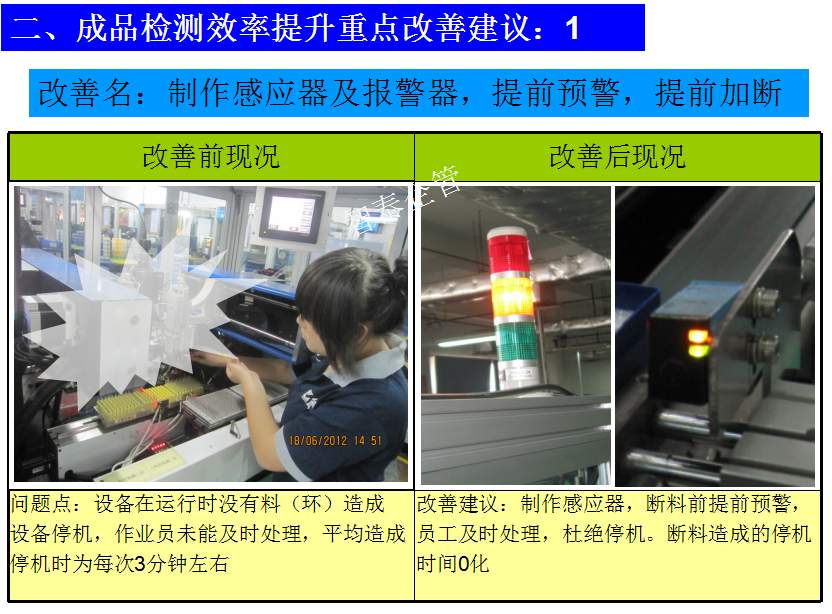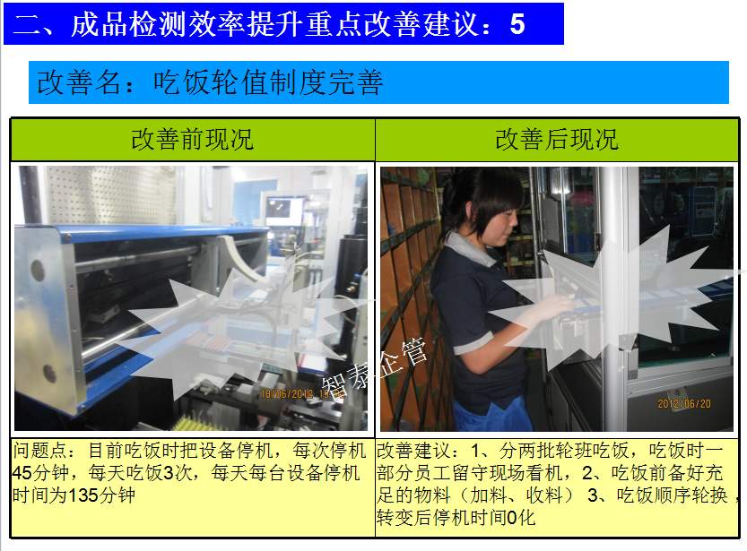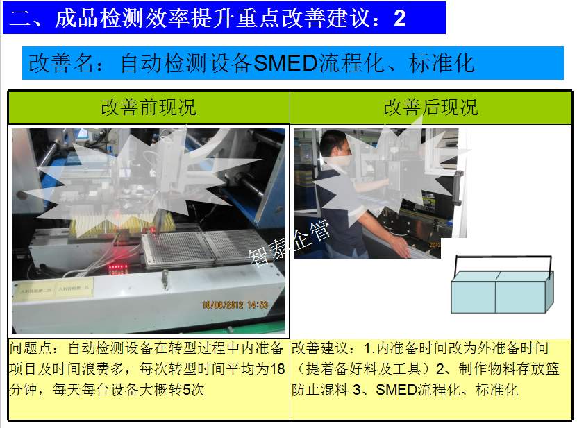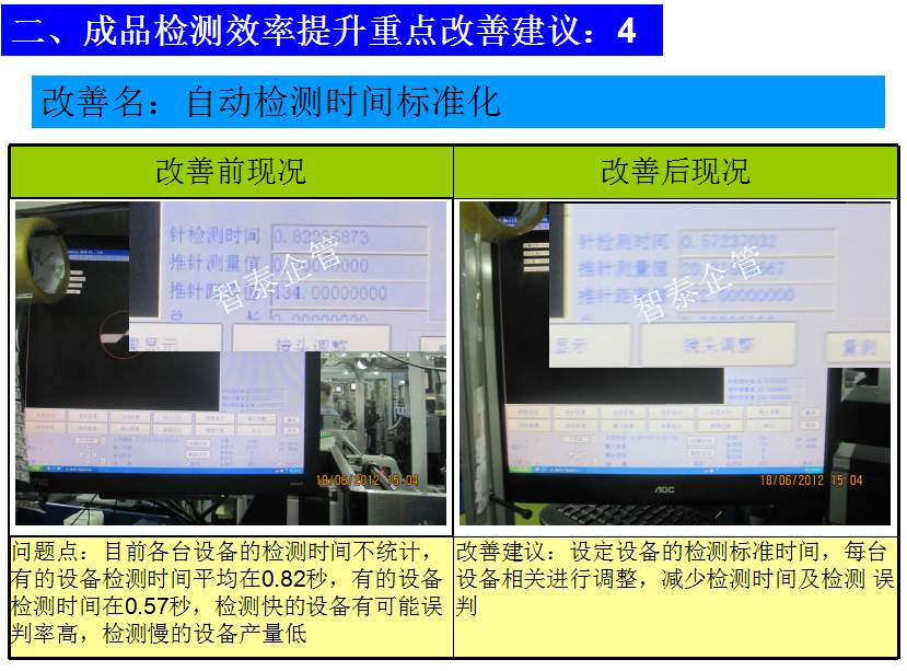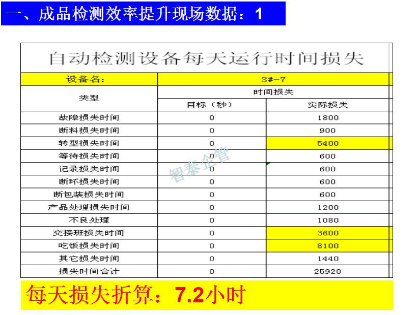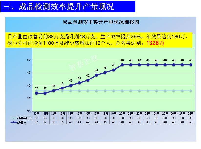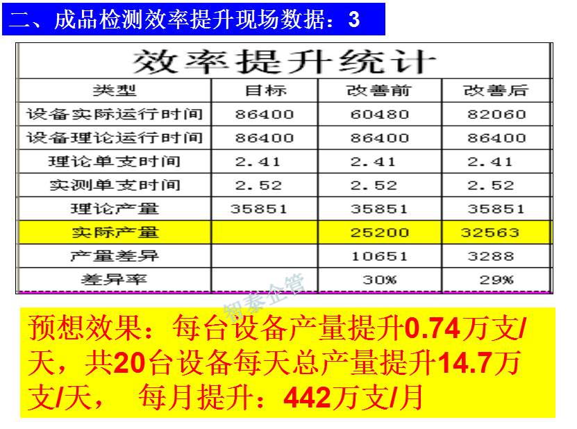 世界級(jí)制造及精益管理是智泰人一生追求的理想,智泰咨詢?cè)谄髽I(yè)推進(jìn)精益生產(chǎn)后平均生產(chǎn)效率提升35%以上,智泰專業(yè)團(tuán)隊(duì)為企業(yè)消除八大浪費(fèi),通過精益管理,提高企業(yè)的生產(chǎn)效率和產(chǎn)品質(zhì)量,持續(xù)推進(jìn)焦點(diǎn)課題改進(jìn)重大問題,每年給企業(yè)帶來的收益平均有800萬(wàn)以上,附件為智泰咨詢顧問團(tuán)隊(duì)為某企業(yè)生產(chǎn)效率提升的案例,請(qǐng)查閱: