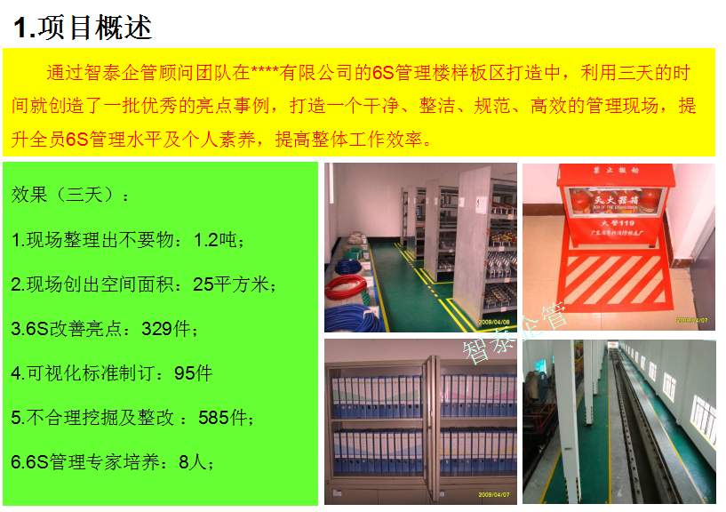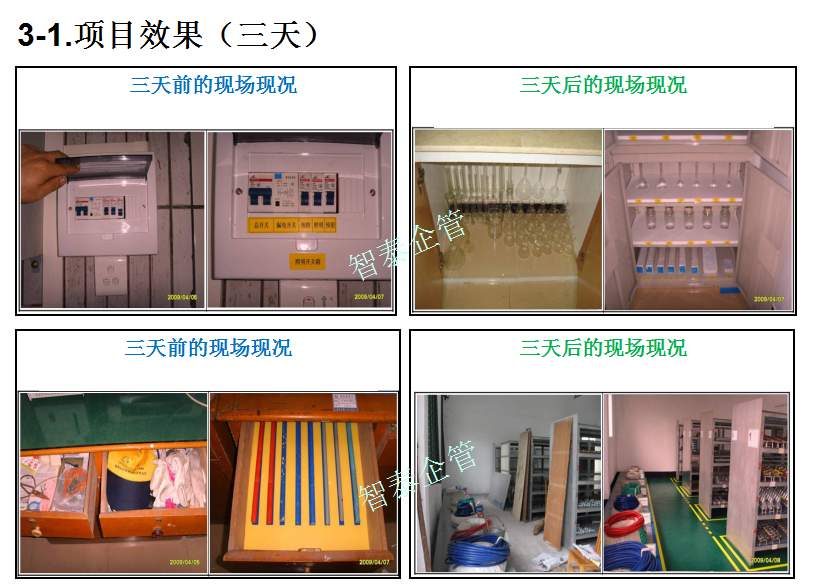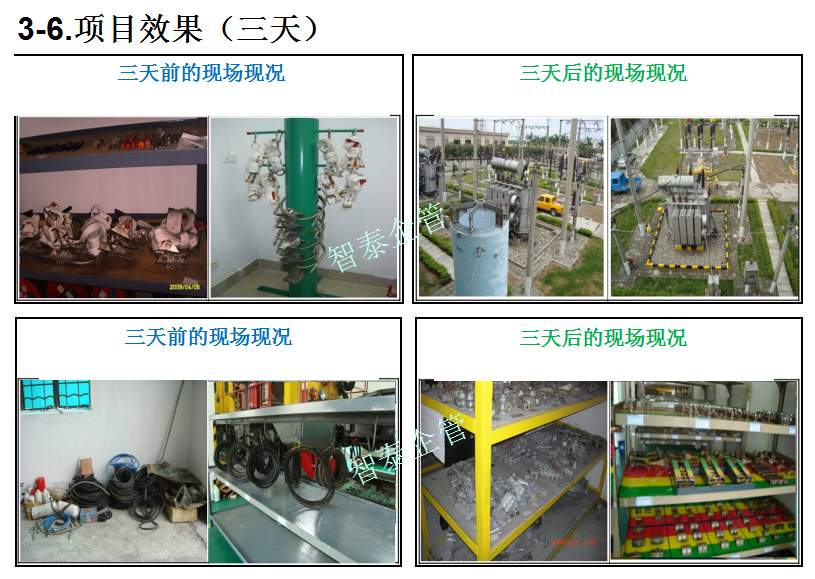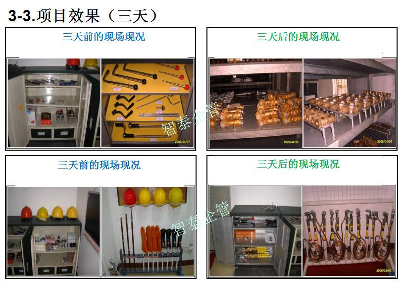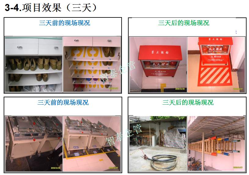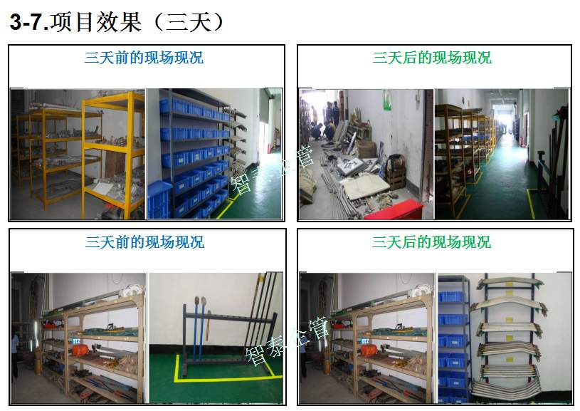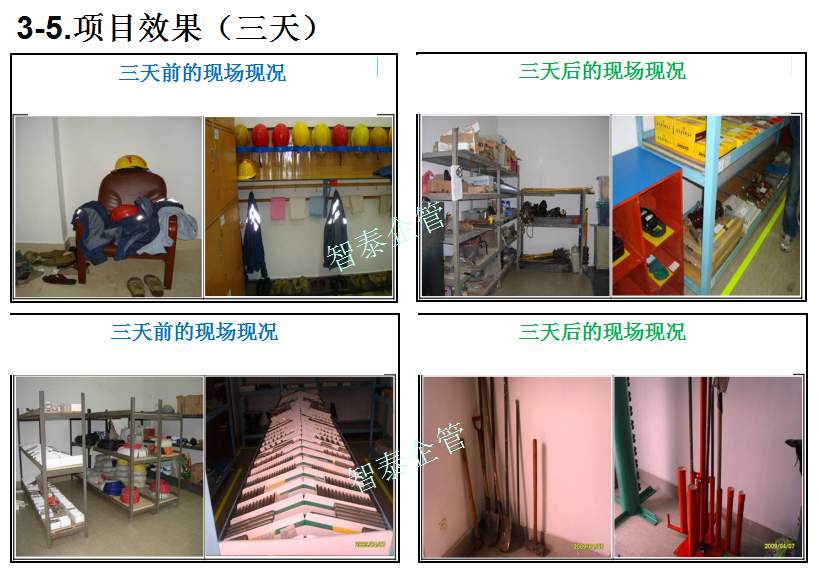 智泰咨詢下屬的5S管理公司首創的產品三天一標桿,三天一條線,三天締造6~8個標桿車間,智泰咨詢專業的顧問團隊為企業的5S管理快速打造已形成一套標準內容,能夠快速在企業全面推進5S管理,附件為智泰咨詢為某企業快速打造5S管理樣板區三天前后對比的現況,請查閱: