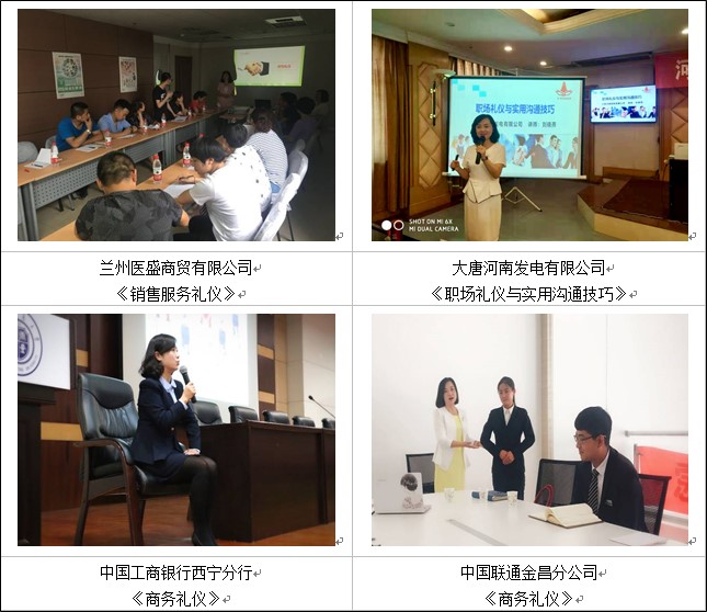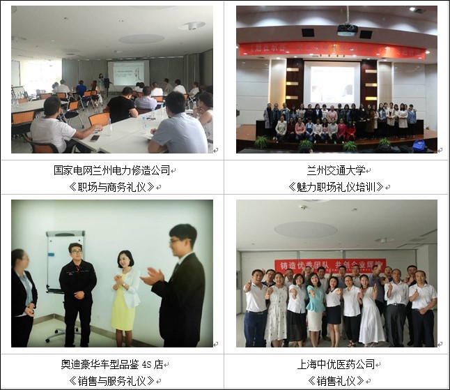 曾為政府、電力、金融、汽車、通訊、建筑等多個領域企業/院校進行過禮儀形象課程培訓,培訓對象涵蓋政府政務人員、企事業單位新入職員工、教師隊伍、醫療行業、企業中層管理者、基層管理者和高層領導等各個層次,至今排課近300場,累計學員10000余人,學員好評率高達98%。