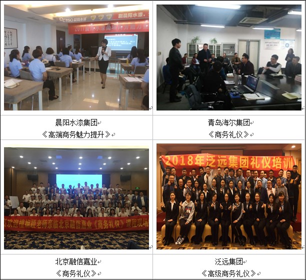 ▲曾為美的、以純、青島海爾集團、寧紡集團等10余家家紡電器企業進行《商務禮儀》《接待與宴請禮儀》《現代職場商務禮儀與交往藝術》課程培訓,其中,《商務禮儀》課程被海爾大學返聘8期。