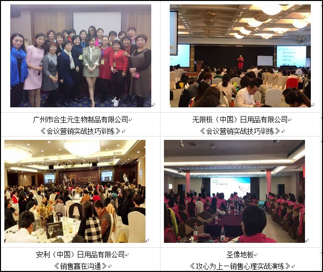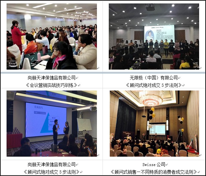 ★ 曾給尚赫天津保健用品有限公司員工講授《會議營銷實戰技巧訓練》、《顧問式銷售邀約技巧》、《銷售贏在溝通》、《顧問式絕對成交5步法則》等系列課程,協助企業完成精英團隊的打造,培訓過程采用項目方式,邊培訓,邊領導團隊實施項目改善,經過《會議營銷實戰技巧訓練》課程后,團隊學以致用,在實際銷售實踐中,團隊銷售翻翻。在此期間培訓返聘率達到100%。