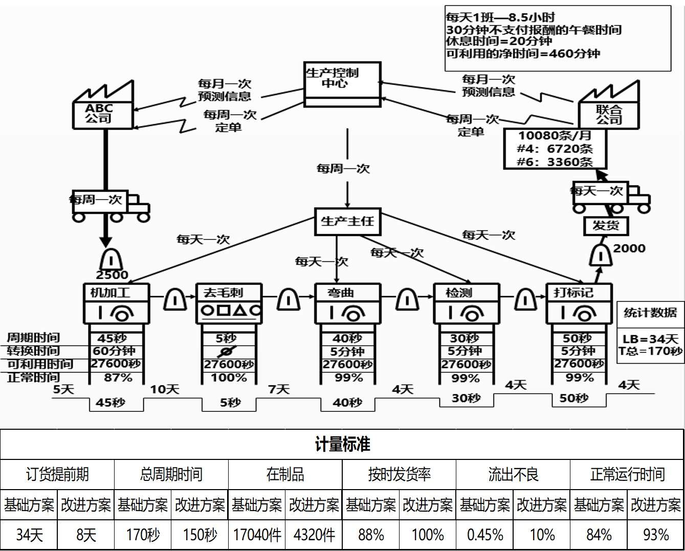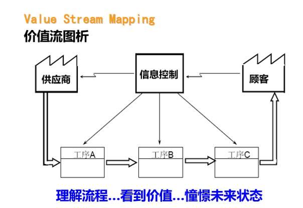 價值流圖(Value Stream Map)是一種使用鉛筆和紙的工具,用一些簡單的符號和流線從頭到尾描繪每一個工序狀態、工序間的物流、信息流和價值流的當前狀態圖,找出需要改善的地方后,再描繪一個未來狀態圖,以顯示價值流改善的方向和結果。