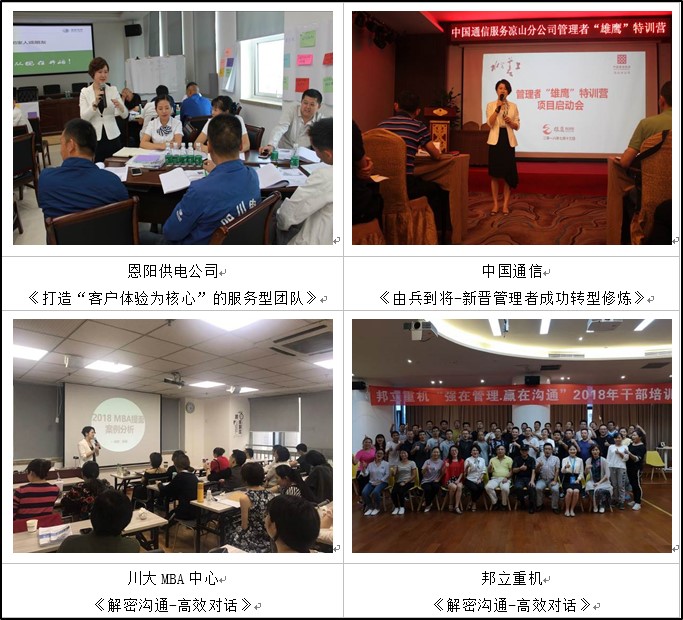 為通訊行業培養1000余名優質員工及管理者:多次應邀為四川移動、成都移動、四川電信、成都電信、四川通信服務公司、涼山通信服務公司等進行《習贏職場-高效能人士的七把金鑰匙》、《由兵到將-新晉管理者成功轉型修煉》、《新員工職業化和服務營銷》等課程培訓,為通訊行業培養1000余名優質員工及管理者,客戶滿意度達94%以上。