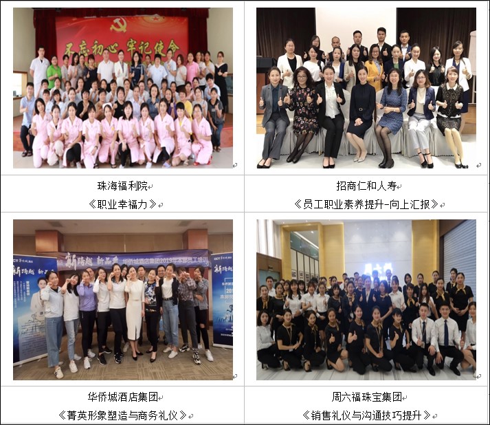 ▲ 曾為周大福集團員工中層正副職和基層員工進行《職場高效溝通力》課程培訓,將職場角色及課程核心知識點融入,幫助員工提升職場溝通能力,得到企業(yè)的一致好評,現(xiàn)場直接加設《商務菁英形象塑造與接待禮儀》課程。