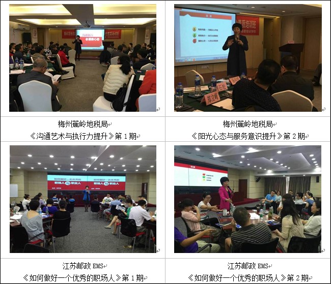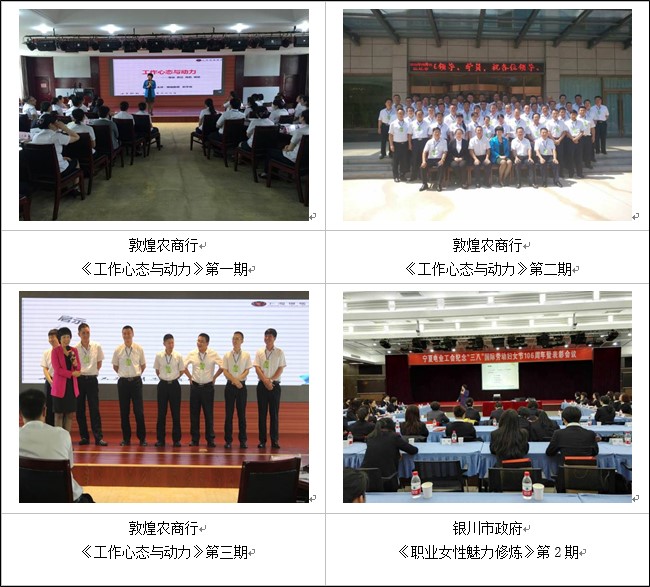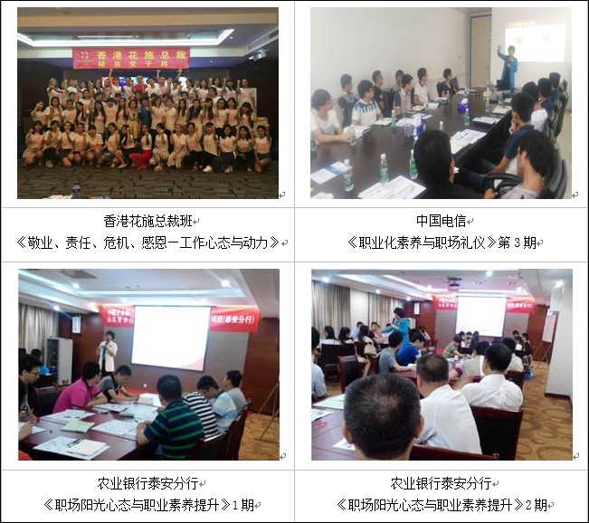 2012年至2014年為河南省郵政、山東省農行、廣東省中行、浙江省建行、廣東省工行、廣東省農信社、廣西農信社進行《陽光心態與職業素養提升》、《正能量與責任》全省輪訓共110余期,學員滿意度都高達97%以上,返聘率高達85%。