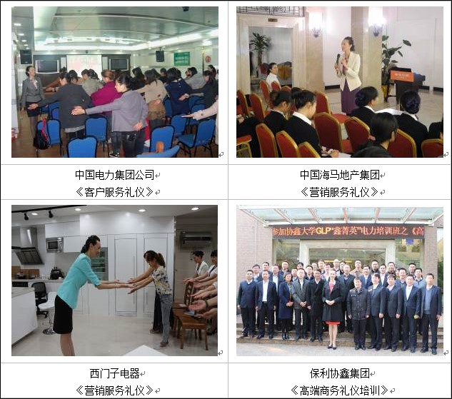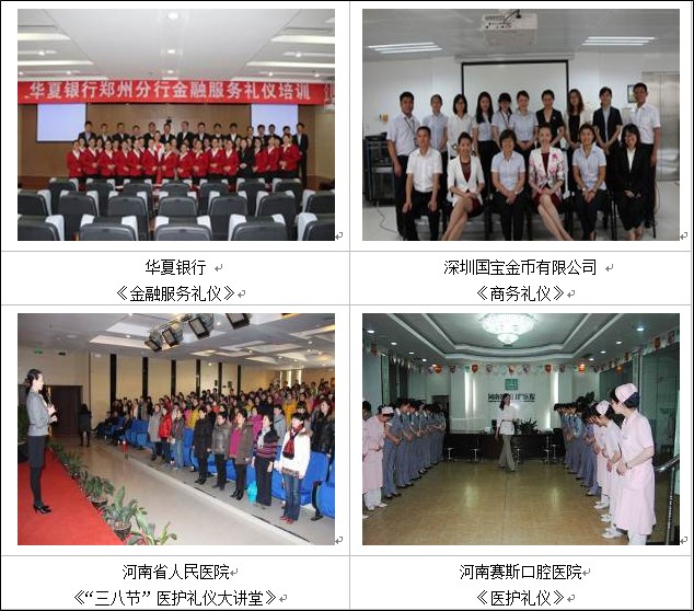 從事禮儀培訓講師15年,擅長針對行業定制禮儀課程,如教師、公務員、醫護人員、地產銷售人員。到目前為止,已為包括航空公司、酒店、醫院、學校、銀行和行政機關、事業單位、國有企業、民營企業、上市公司等提供專業的服務禮儀培訓,共服務企業客戶近1000家,服務客戶總數超過120000人次。