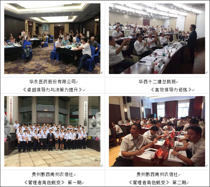 高校與政府機構:山西電力黨校、深圳清華大學研究院、清華大學PE總裁班、中山大學(MBA)廣州研究院、中山大學(MBA)江門研究院、西點執行力學院、武漢大學經管學院EDP、東莞黃岡貴族理想學校、深圳市學知文化、南昌財經大學、上海交通大學、蘇州大學、新疆財經大學、涼山州國資委……