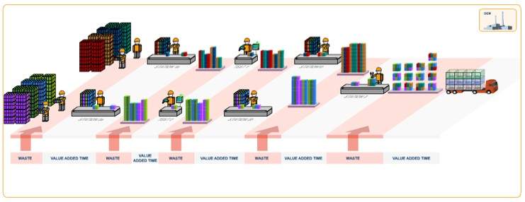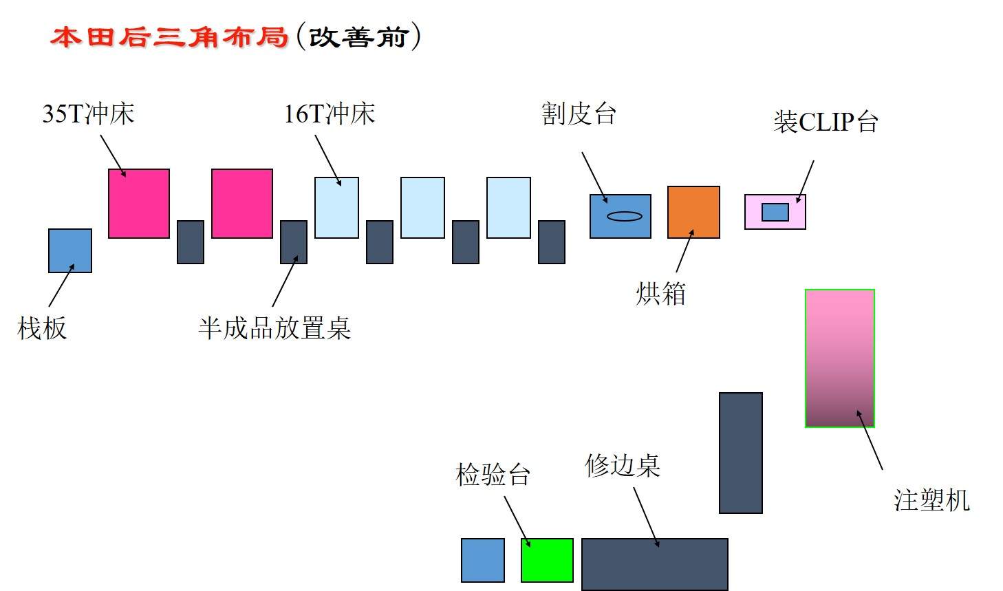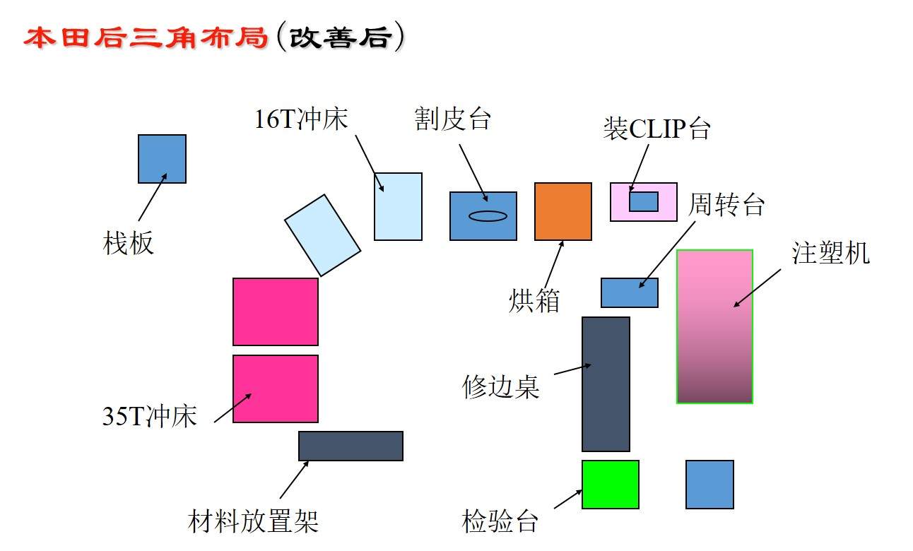 在一些工廠中經(jīng)??梢钥吹?,不同工序的加工設備之間的距離非常遠,搬運到下一道工序,這樣的現(xiàn)象被稱為孤島設備。“一個流”生產(chǎn)要求放棄按設備類型排列的布局,而是按照加工順序來排列生產(chǎn)設備,避免孤島設備現(xiàn)象的出現(xiàn),盡可能使設備的布置流水線化,真正做到只有“一個流”。