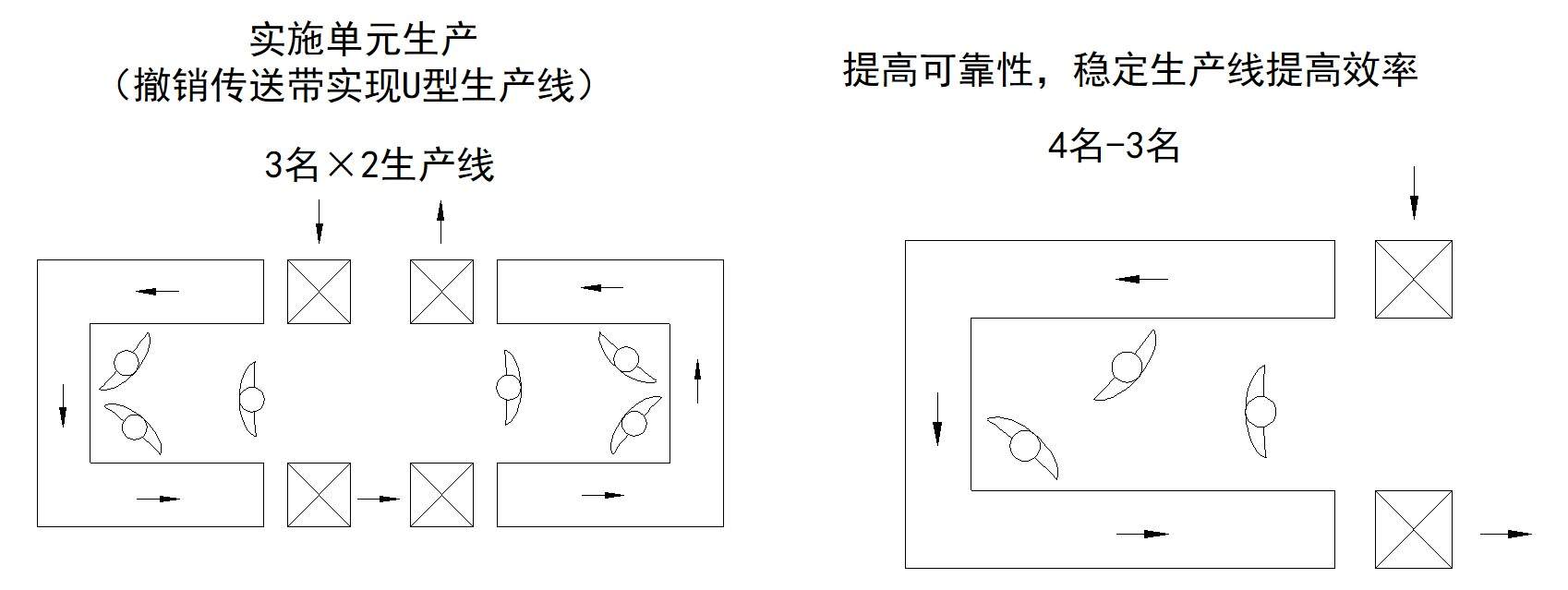 如果將生產(chǎn)設備一字擺開,工人從第一臺設備到最后一臺設備就需要走動很遠的距離,從而造成嚴重的人力浪費。因此,“一個流”生產(chǎn)要求將生產(chǎn)設備按照“U”字型來排列,從入口到出口形成一個完整的“U”型,這樣就可以大量的減少由于不同工序之間的傳遞而造成的走動,減少時間和搬運的浪費,增加生產(chǎn)效率。
