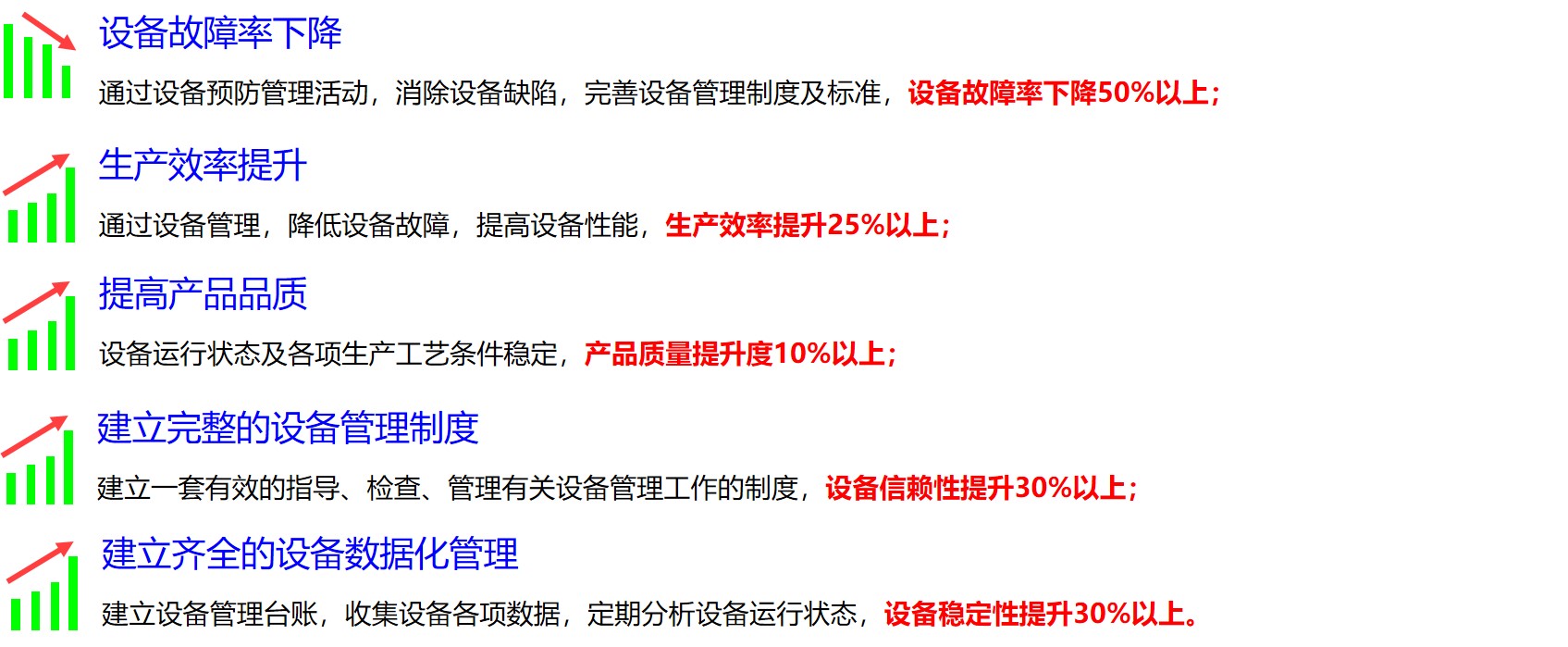 生產效率提升50%以上;產品質量提升度30%以上;生產經營成本下降10%以上;設備故障率下降70%以上---確保成為行業標桿和最高競爭力企業