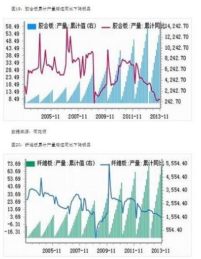 2013年11月,我國(guó)人造板產(chǎn)量為2605.8萬(wàn)立方米,同比增加1.8%;累計(jì)產(chǎn)量24349萬(wàn)立方米,同比增加5.1%;同比增速均在放緩。具體到膠合板,11月份產(chǎn)量為1489.78萬(wàn)立方米,同比增長(zhǎng)5.4%,累計(jì)產(chǎn)量14152.3萬(wàn)立方米,同比增長(zhǎng)8%;纖維板方面,11月份產(chǎn)量為600.97萬(wàn)立方米,同比增長(zhǎng)-1.82%,累計(jì)產(chǎn)量5358.77萬(wàn)立方米,同比增長(zhǎng)3.12%。產(chǎn)量的下降意味著市場(chǎng)需求的減弱,人造板需求高速增長(zhǎng)的時(shí)代已經(jīng)過(guò)去。
