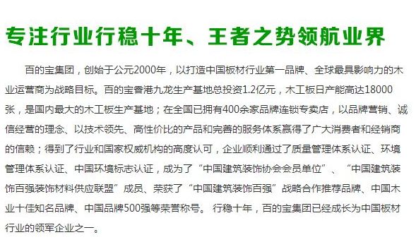 家居行業(yè)的文化更多的是要倡導(dǎo)無污染,倡導(dǎo)綠色健康家居生活理念,讓更多的百姓遠離污染,遠離裝修污染,遠離空氣污染,真正享受健康,享受環(huán)境,而對百的寶來說,提供高品質(zhì)環(huán)保產(chǎn)品本身就是企業(yè)的基本責(zé)任和義務(wù)。
