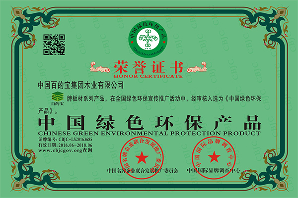 “中國綠色環保產品”榮譽稱號是中國百的寶集團木業有限公司的無形資產,也是百的寶板材全體員工不懈努力的動力。