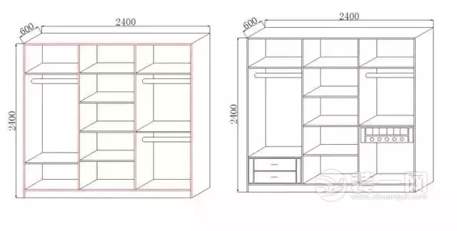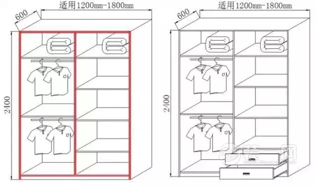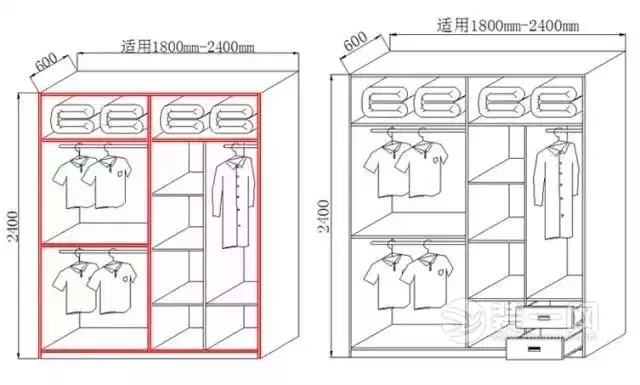 一般需要將衣柜左右兩邊分別設置成男女方各自的儲衣空間。
